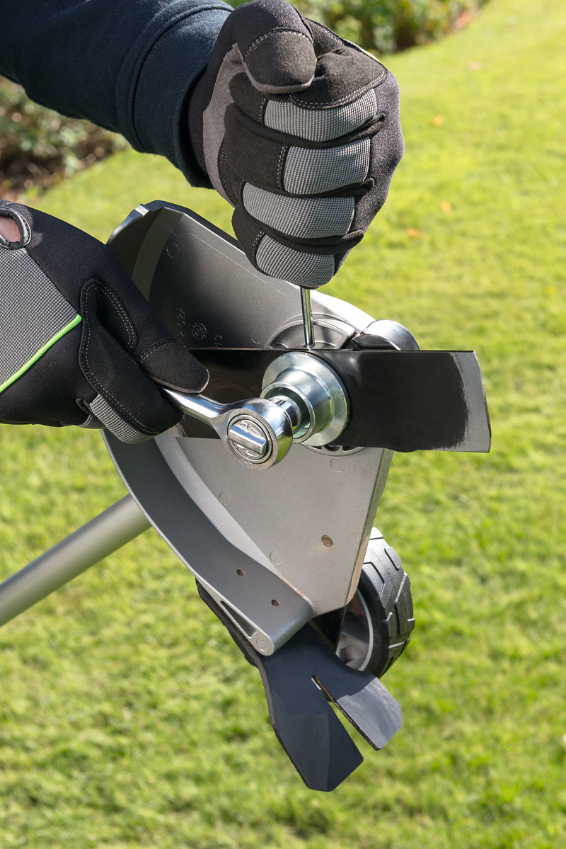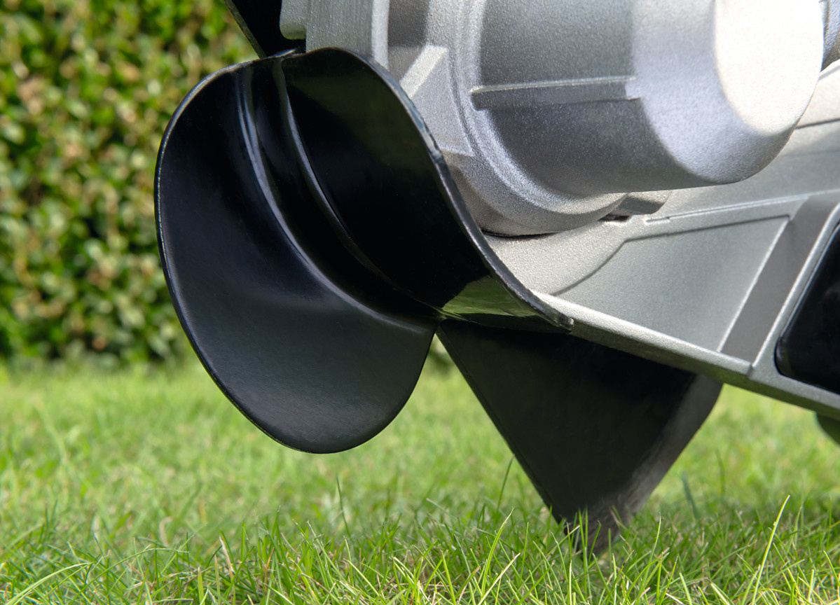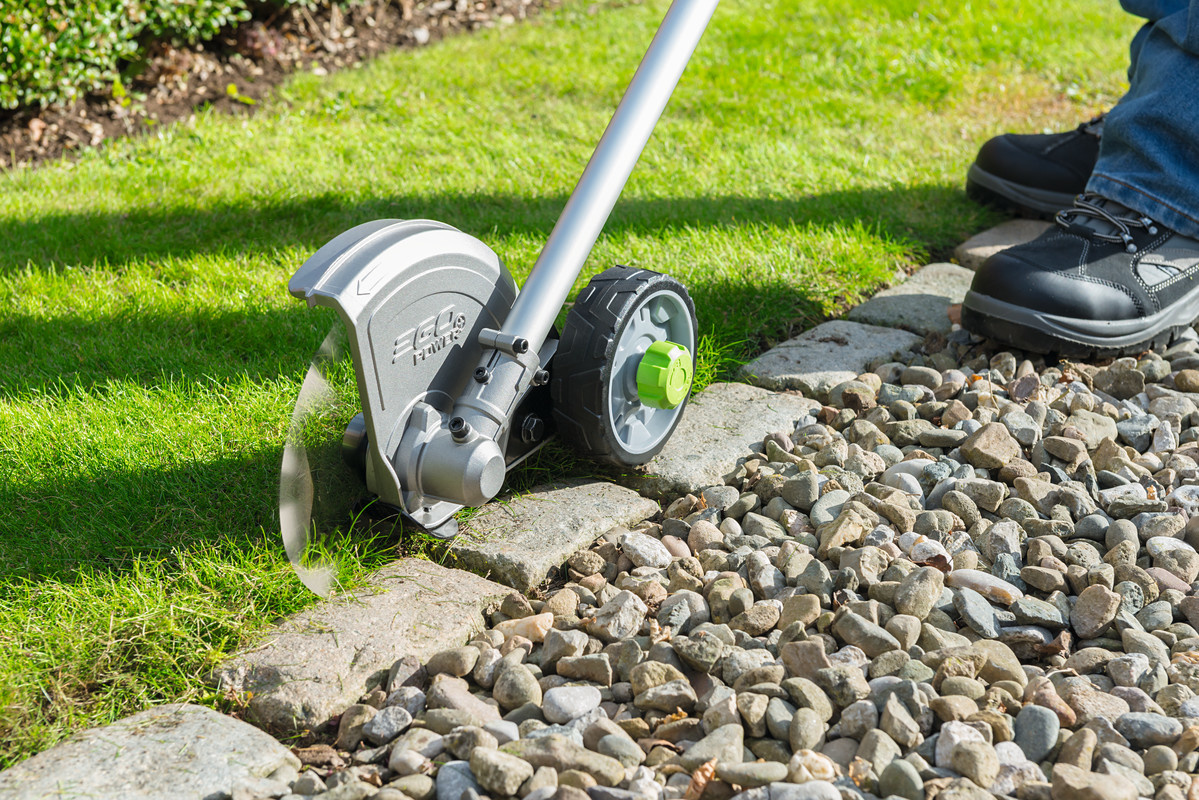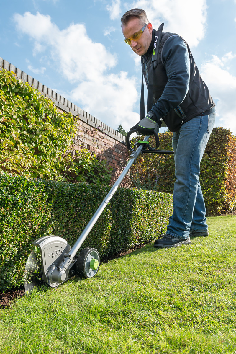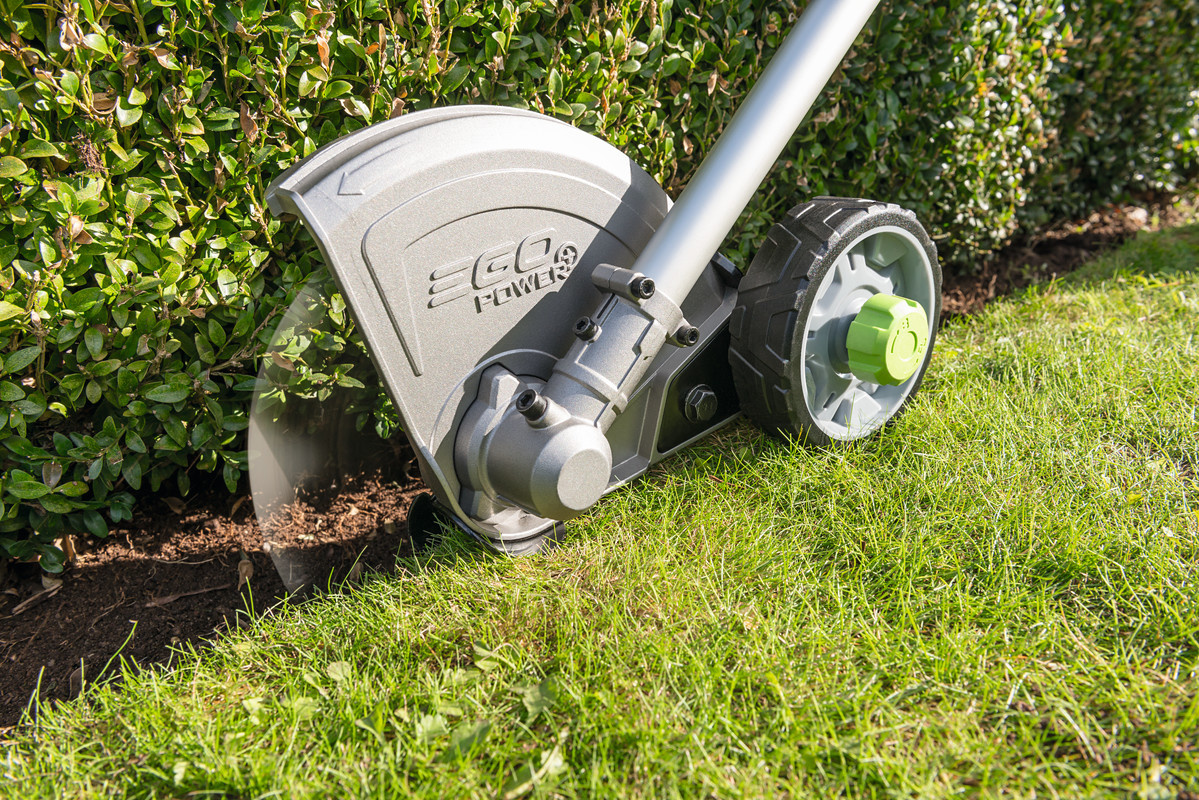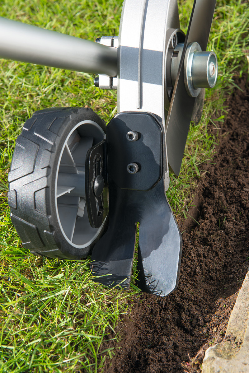 De kantensnijder zorgt voor een strak afgewerkte gazonrand. Voorzien van een aluminium beschermkap met rubber rand om de gebruiker tegen rondvliegend materiaal te beschermen. Uitgerust met in hoogte verstelbaar loopwiel.